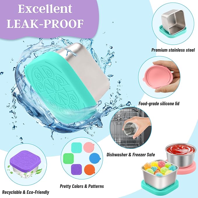 - 【SAFE AND RELIABLE MATERIAL】: The small container with lid is made of quality 304 stainless steel and food-grade safe silicone, which makes our sauce cup non-toxic, dishwasher safe, freezer safe and durable enough for long-termism lifestyle. Our salad container for lunch can completely replace disposable containers, reduce the use of plastic and achieve environmental protection