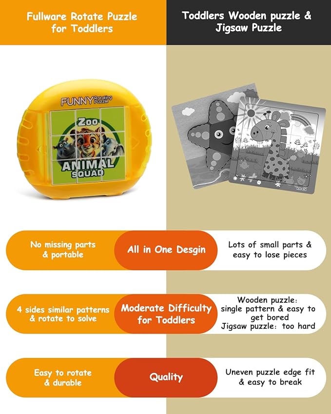 - A HANDY TOY FOR OUTINGS - Whether in the car or at a restaurant, our compact Rotating Puzzles can be carried along and it keeps children quiet and occupied. Moreover, there is no risk of missing pieces after playing with this all-in-one design puzzle!