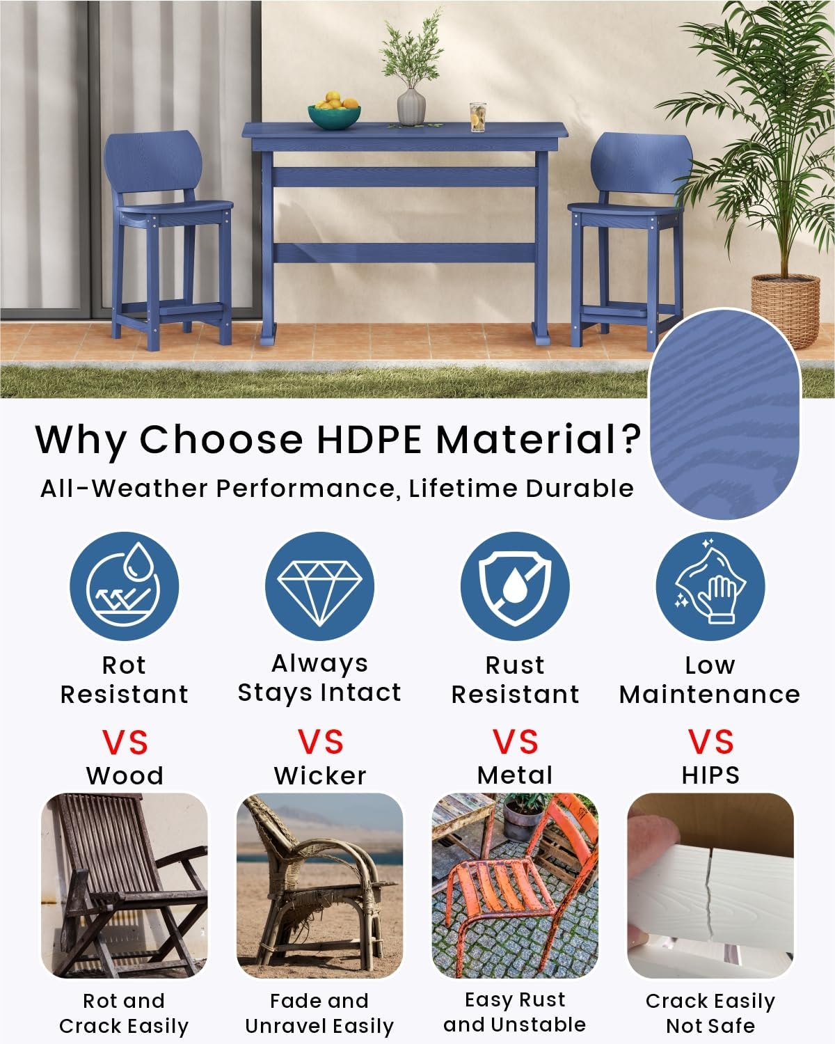 - Weatherproof: Constructed from HDPE—a robust, durable polymer—this set outperforms traditional wood, metal and wicker. It resists splintering, cracking, peeling, rotting, and rusting, making it the ideal choice for outdoor furniture that endures the elements.