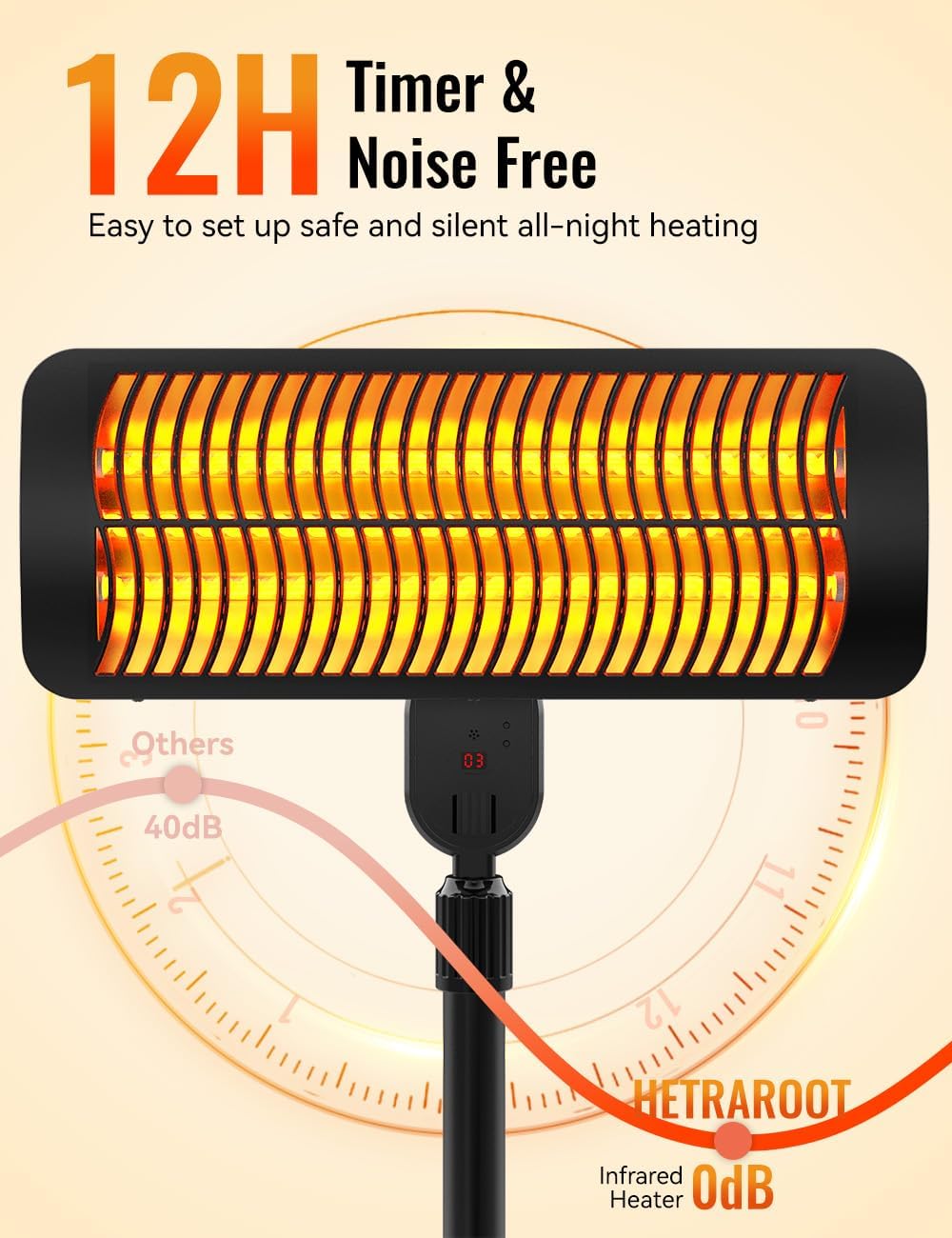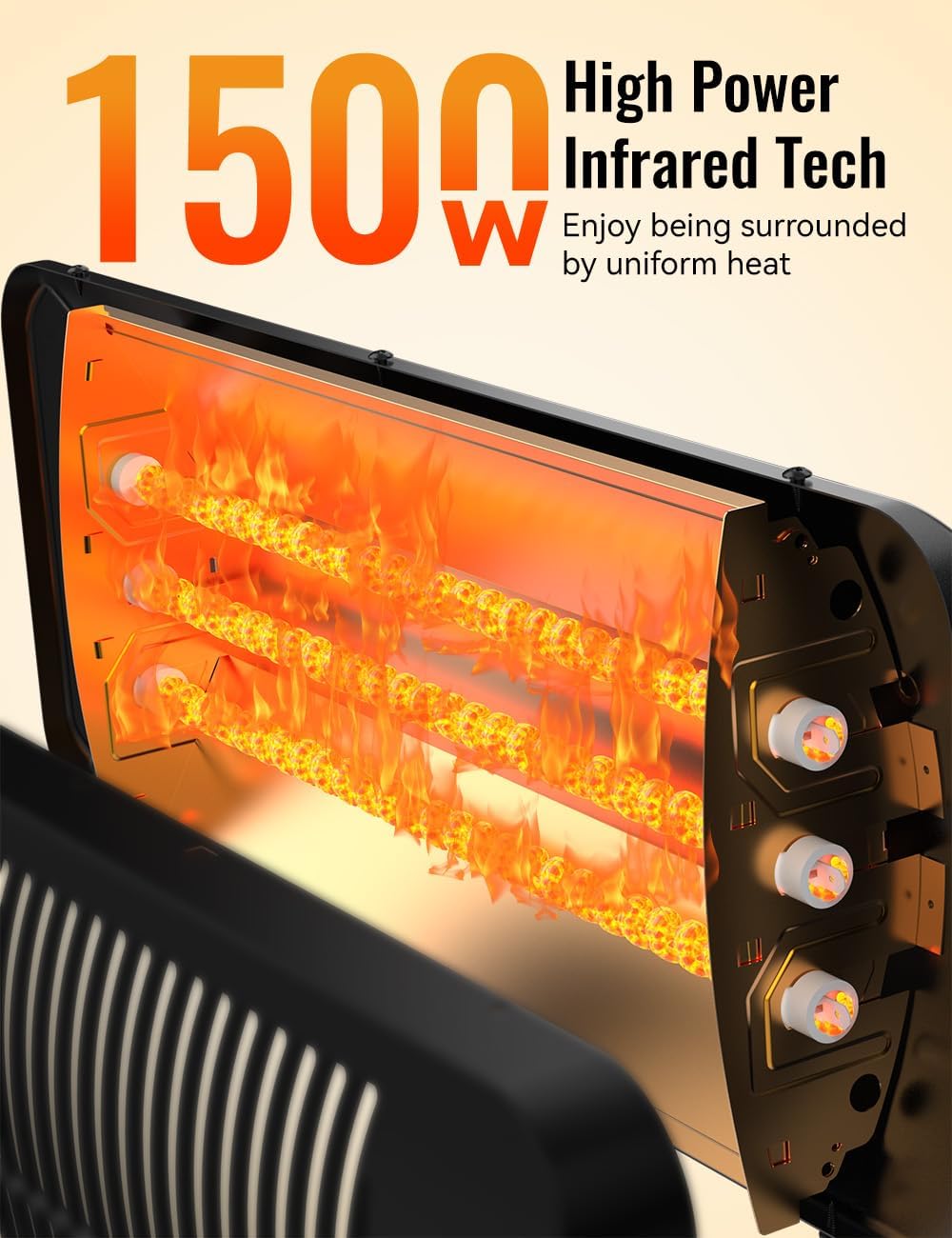 - 🔥【12H Smart Timer & Noise Free】Easily set the heating duration with 12H timer. Before bedtime, put the electric patio heater to auto shut off after you fall asleep, ensuring safety all night and saving energy. During outdoor parties, set it to turn off after the event ends, guaranteeing safety and energy savings even if you forget to turn it off. The room heater runs silently! Only infrared heating without blowing noise, perfect for providing a quiet rest or work space.