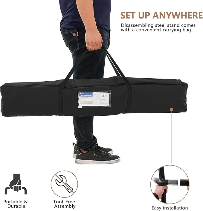 - EASY TO ASSEMBLE:The assembly of this hammock is very simple, no tools are needed. After the bracket is assembled, the hammock can be hung on the hook of the bracket directly, and it can be easily disassembled in few minutes as well.