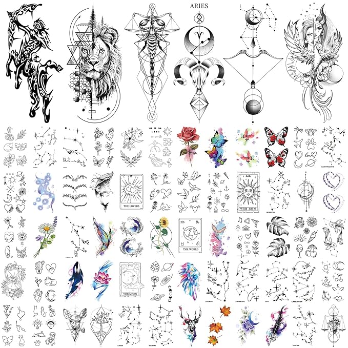 77 Sheets Temporary Tattoo, 17 Sheets Half Arm Lion Owl Antelope Rose Butterfly Constellation Chest Tattoos for Adults Men Women, 60 Sheets Small Tattoos Stickers for Boys Girls Kids Body Art Design