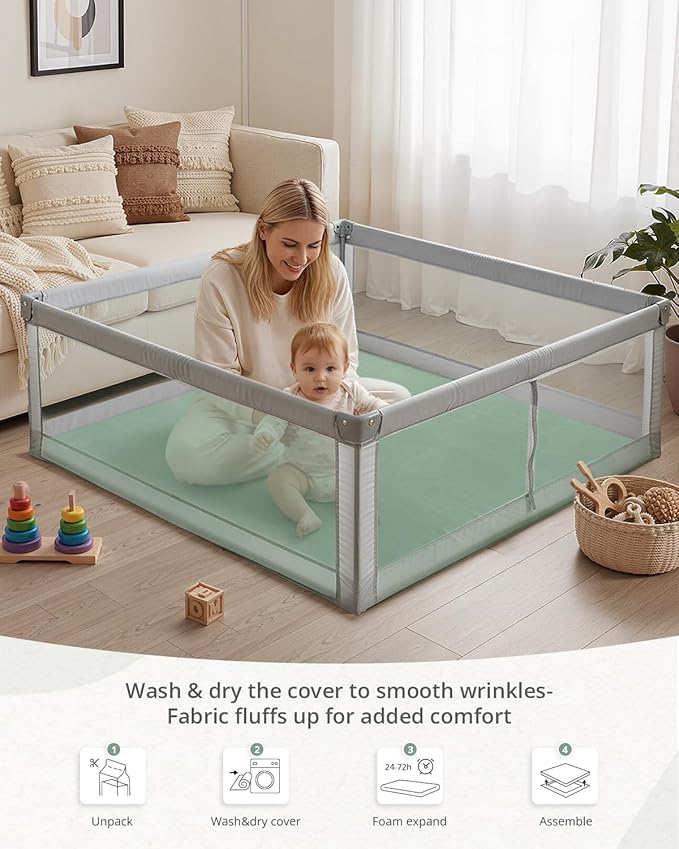 - Removable & Washable Slip-On Cover – Unlike one-piece foam mats that can’t be washed, our slip-on cover design can be easily removed for machine washing. This allows parents to deep clean, ensuring a safer and cleaner play space for babies