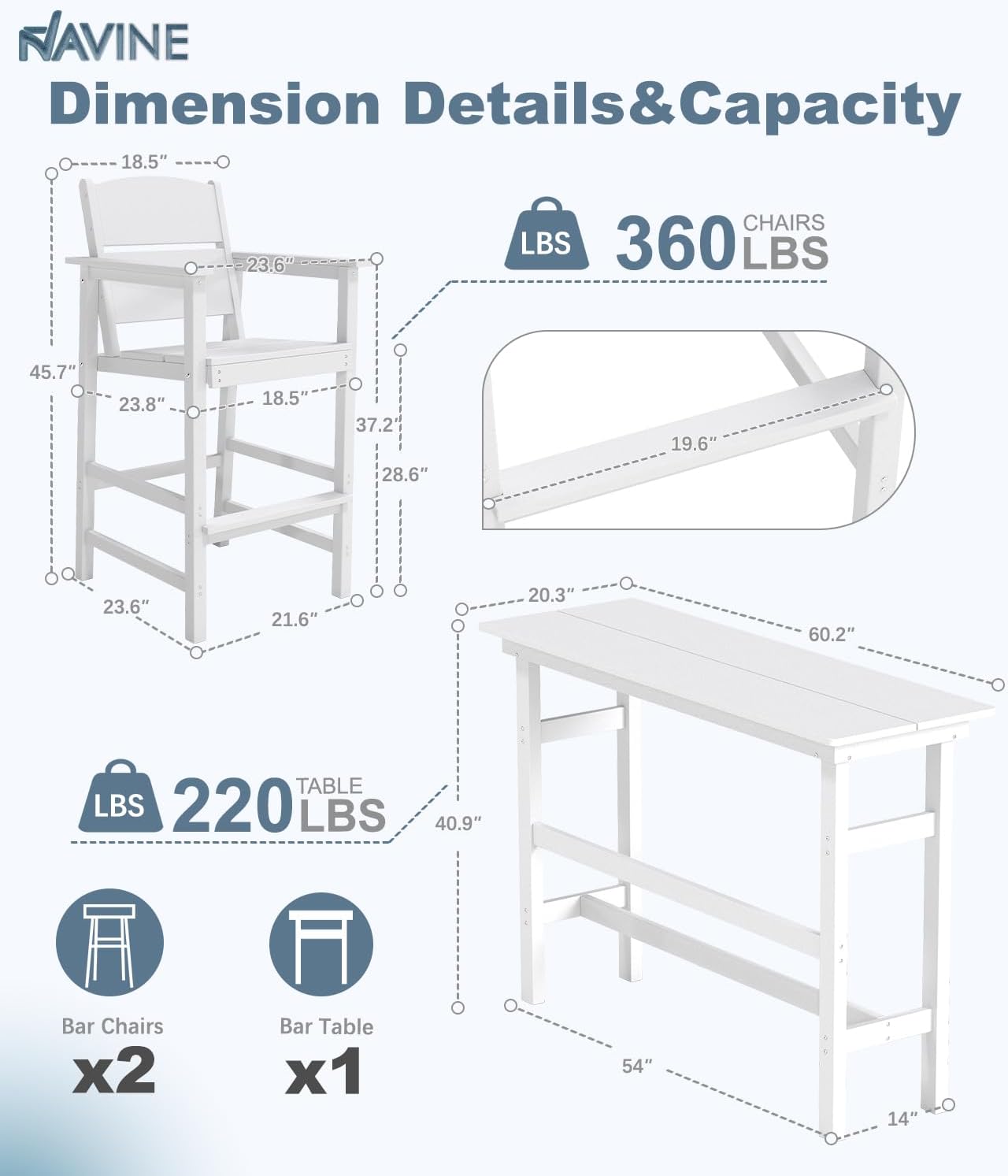 - Complete 3-Piece Bar Set: Includes 1 piece high-top patio table (60.2"L x 20.3"W x 40.9"H) and 2 pieces matching Adirondack bar chairs (23.6"W x 23.6"D x 45.7"H). Engineered heights provide optimal comfort and a wide view. Each chair holds 350 lbs, the table supports 220 lbs.