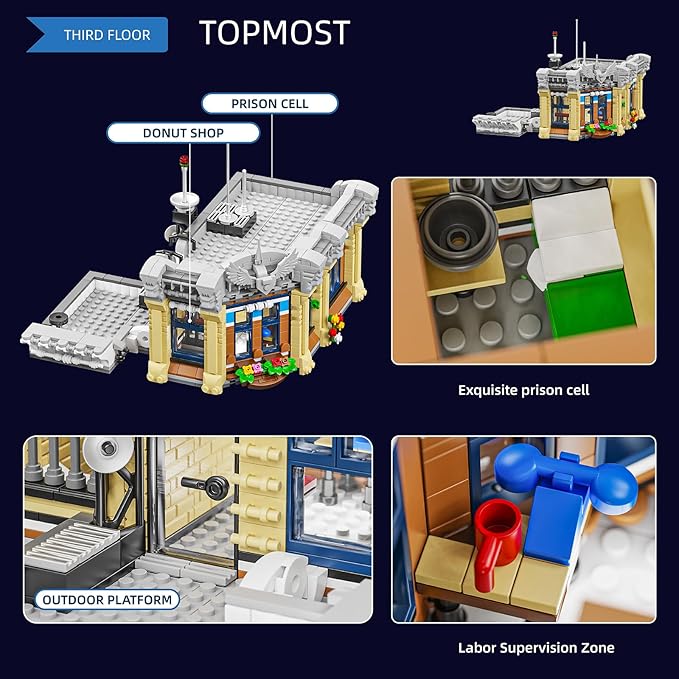 - Build a vibrant scene with 2967 high-quality blocks, including a police car, parking, reception desk, file room, interrogation room, and charming dessert shop. Includes 6figures: File Officer, Prisoner, Bakery Owner, and 3 distinct Police Officers.
