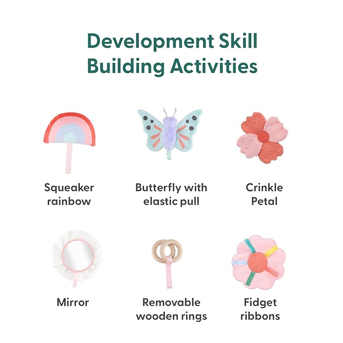- Padded Play Mat for Baby - Encourage your baby girl's development with this versatile interactive baby activity mat. Features engaging sounds, fidget crinkle ribbons, peekaboo flap, 2 removable wooden teething rings and baby safe mirror.