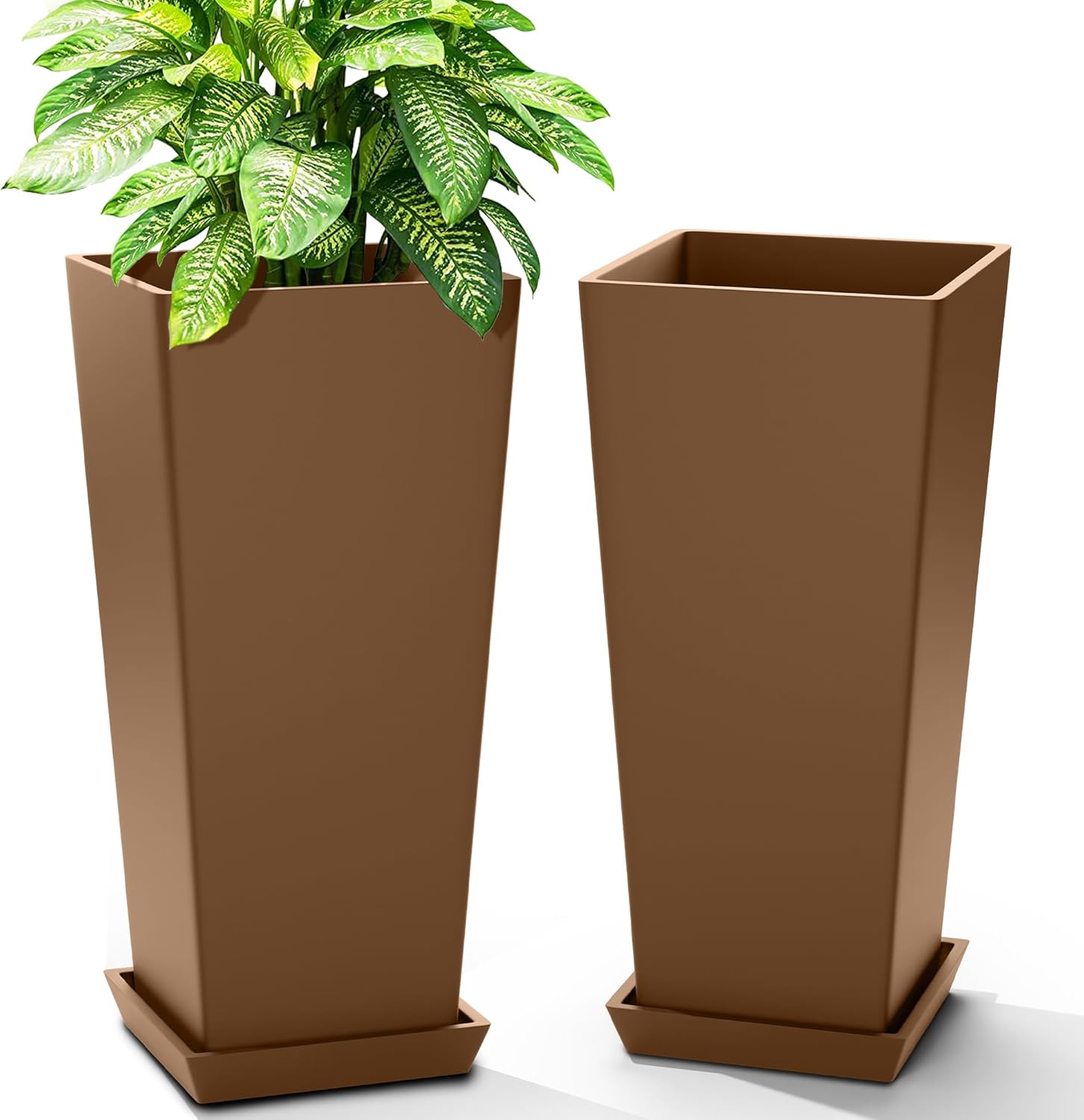 FENCY Set of 2 Tall Planters for Outdoor Plants, 24 Inch Large Tapered Pots with Drainage Trays, Weather-Resistant Plastic Plant Containers for Patio, Porch, Garden, Front Door Decor,Brown