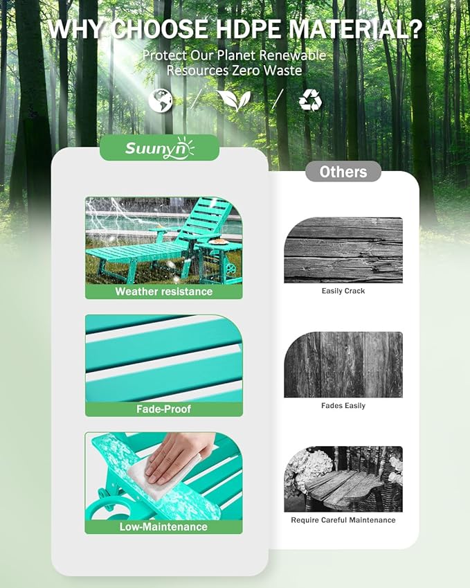 - Premium Suunyn HDPE: The polywood chaise lounge are made from high-density HDPE, which bends slightly under heavy weight or high temperature but returns to its original shape when the weight is removed or the temperature has dropped. This durable material withstands harsh weather and is easy to clean