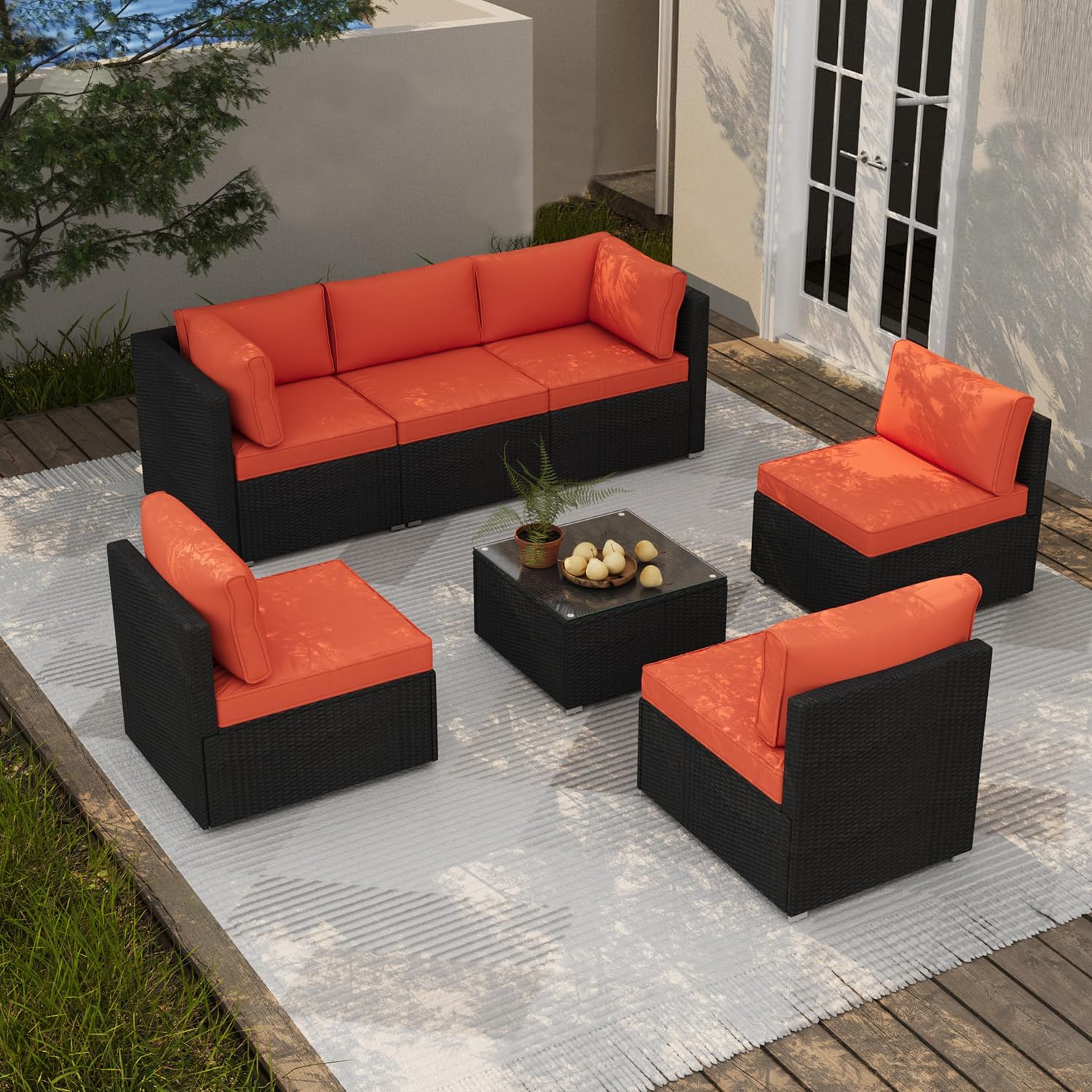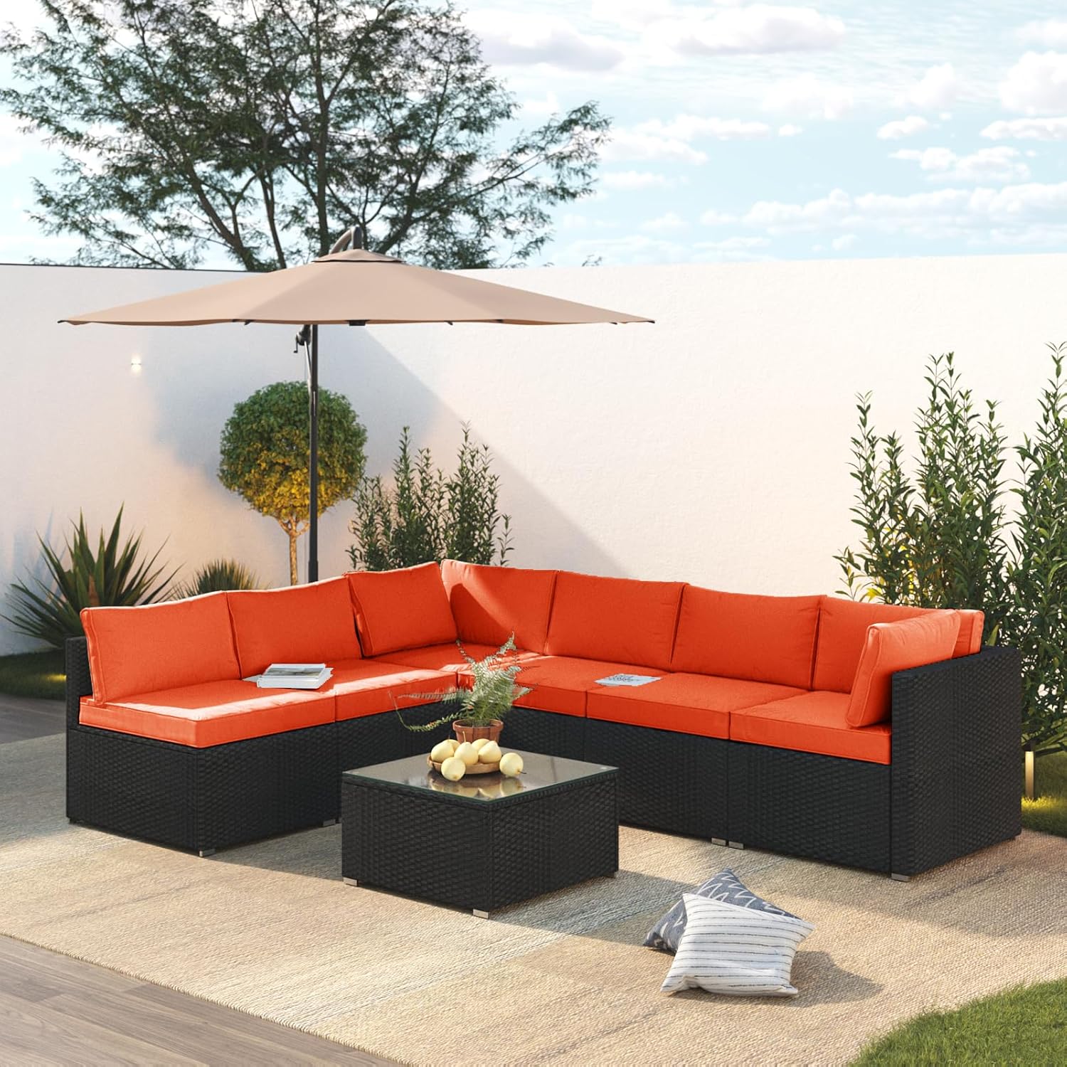 7 Piece Patio Furniture Set, Outdoor Couch Set—All-Weather Outdoor Furniture Sectional w Water Resistant Thick Cushions, Patio Sofa Set w 2 Extra Pillows and Coffee Table, Orange/Black