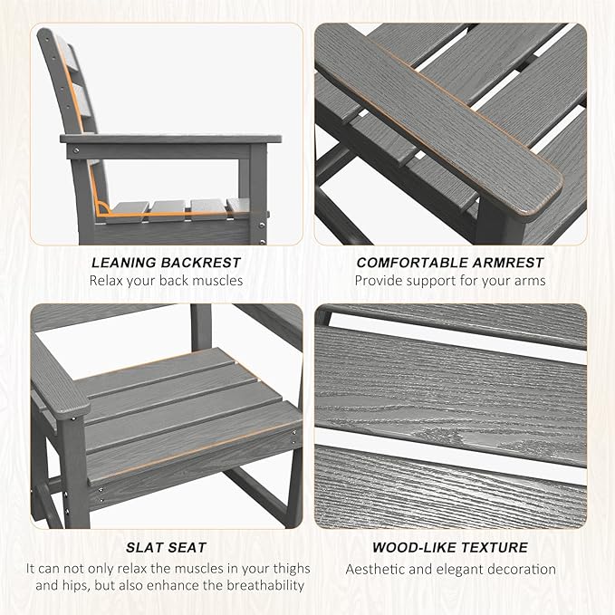 - 【All-Weather Material】Made of High-density polyethylene (HDPE) and 304 stainless steel hardware, this patio dining set is long-lasting and will not crack, scratch, rust, or fade over time. In addition, the table and chairs are designed with an elegant wood-like texture, combining both practicality and aesthetics.