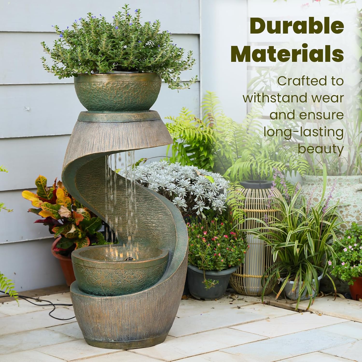 - Effortless Assembly with Long Power Cord Assembly is quick and tool-free—just connect the included UL-certified pump and transformer, fill with water, and plug in. With a 118-inch cord, this outdoor water fountain with LED lights offers flexible placement in gardens, patios, or indoor sunrooms. No plumbing required.