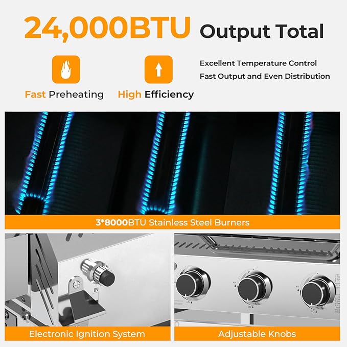 - RAPID & EVEN HEATING: Experience rapid and even heating with 3 tube burners totaling 24,000 BTU, Enamel wire grate and V-shaped flame tamers. Adjust heat levels effortlessly with dual control knobs, ensuring precise temperature control. The gas grill adopts electric ignition to ensure quick and reliable starts.