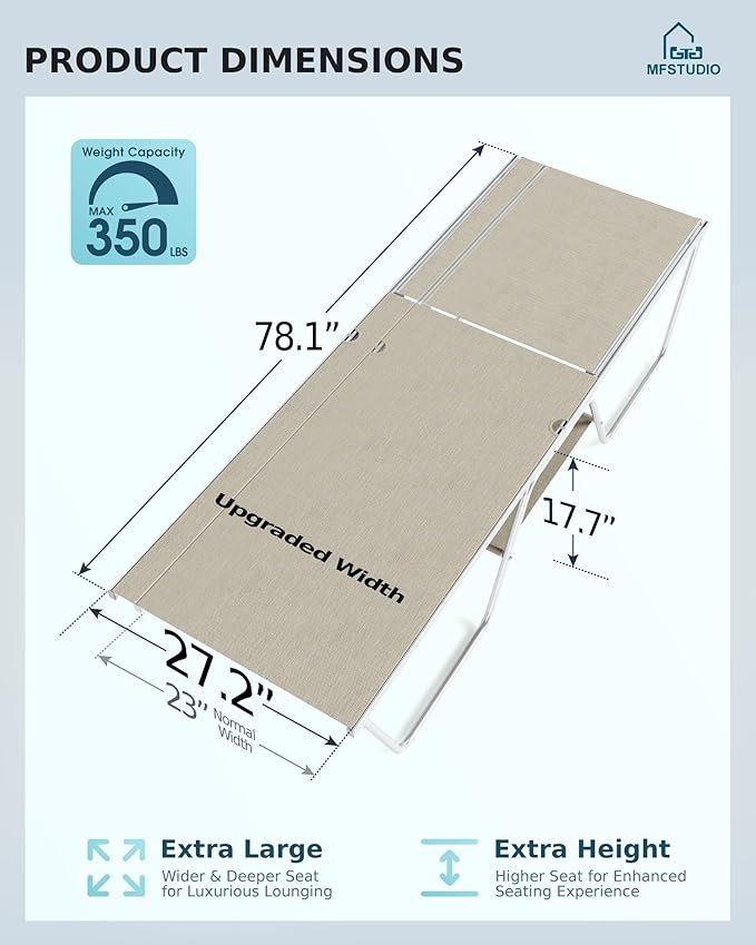 - Larger & Stable - Outdoor loungers are more wider and higher for enhancing seating experience. Unique W-shape frame and the large contact area of the four crossbars ensures the safety of each leisure posture and can support up to 350lbs