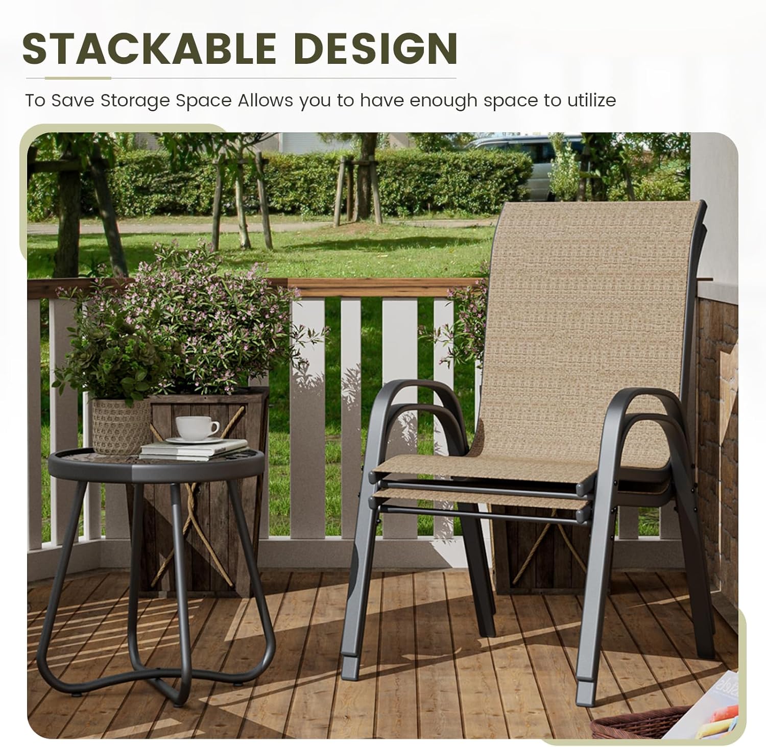 - 【OUTDOOR STACKABLE DINING CHAIRS】The stackable design allows you to both easily stack these patio chairs for compact storage, saving valuable space in your home or outdoor space. Lightweight design allows you to easily move these outdoor chairs and place them wherever you need them to be