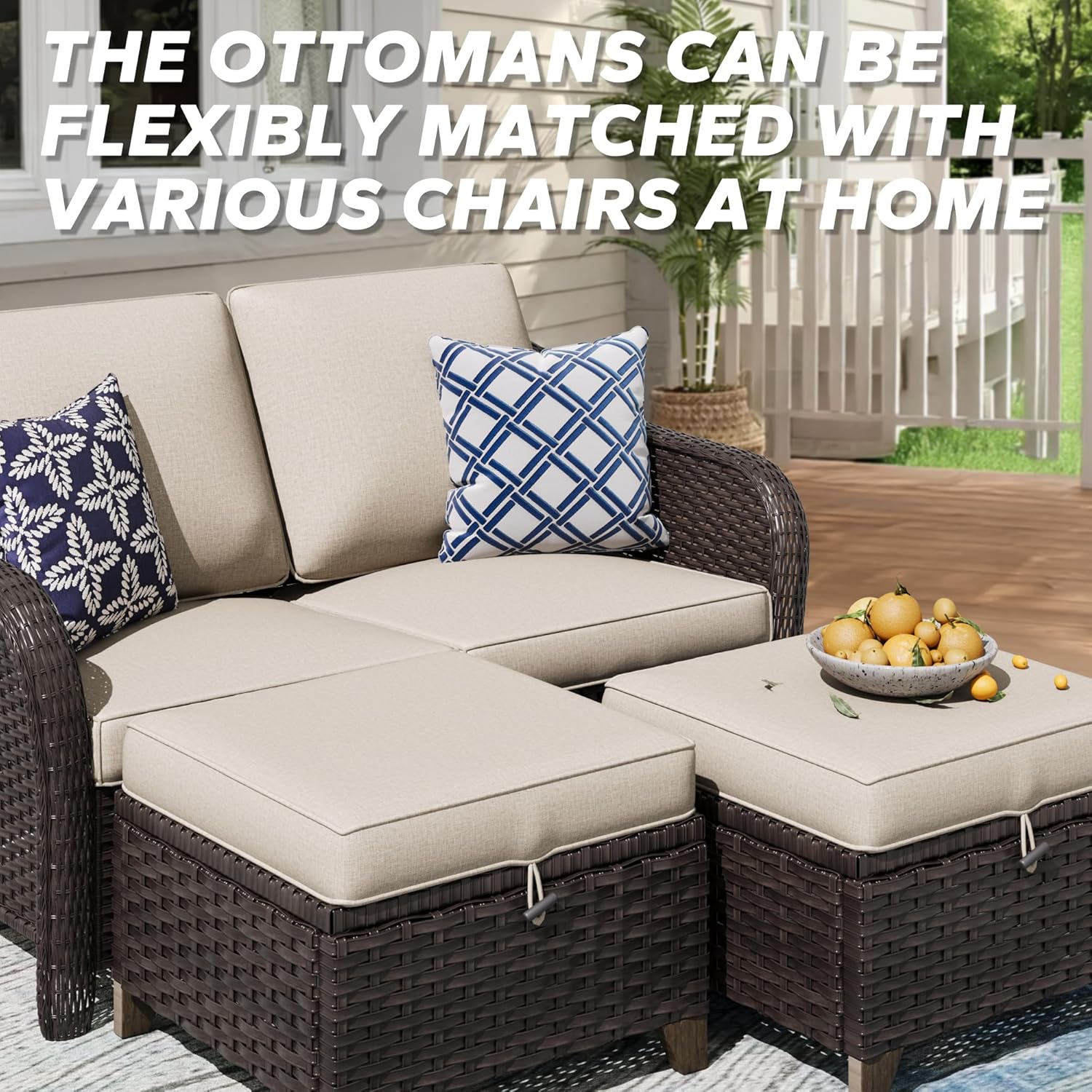 - Packing Included: The 3 pcs set includes 2 x ottomans, 1 x 2-seat sofa. The tools and instructions needed for installation will also be in the box. The 3 pieces patio dining set will come in 2 boxes. They may come in different days