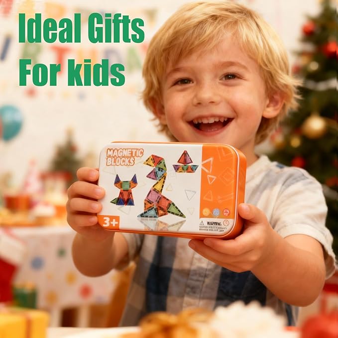 - 【60PCS Mini Magnetic Tiles with Portable Iron Case】 This 60-piece magnetic building blocks set comes with a durable iron storage box that doubles as a magnetic building base. It's the perfect travel toy for kids, providing screen-free entertainment on long car rides, flights, and during restaurant visits. Keep your child engaged and creativity flowing while on the go.