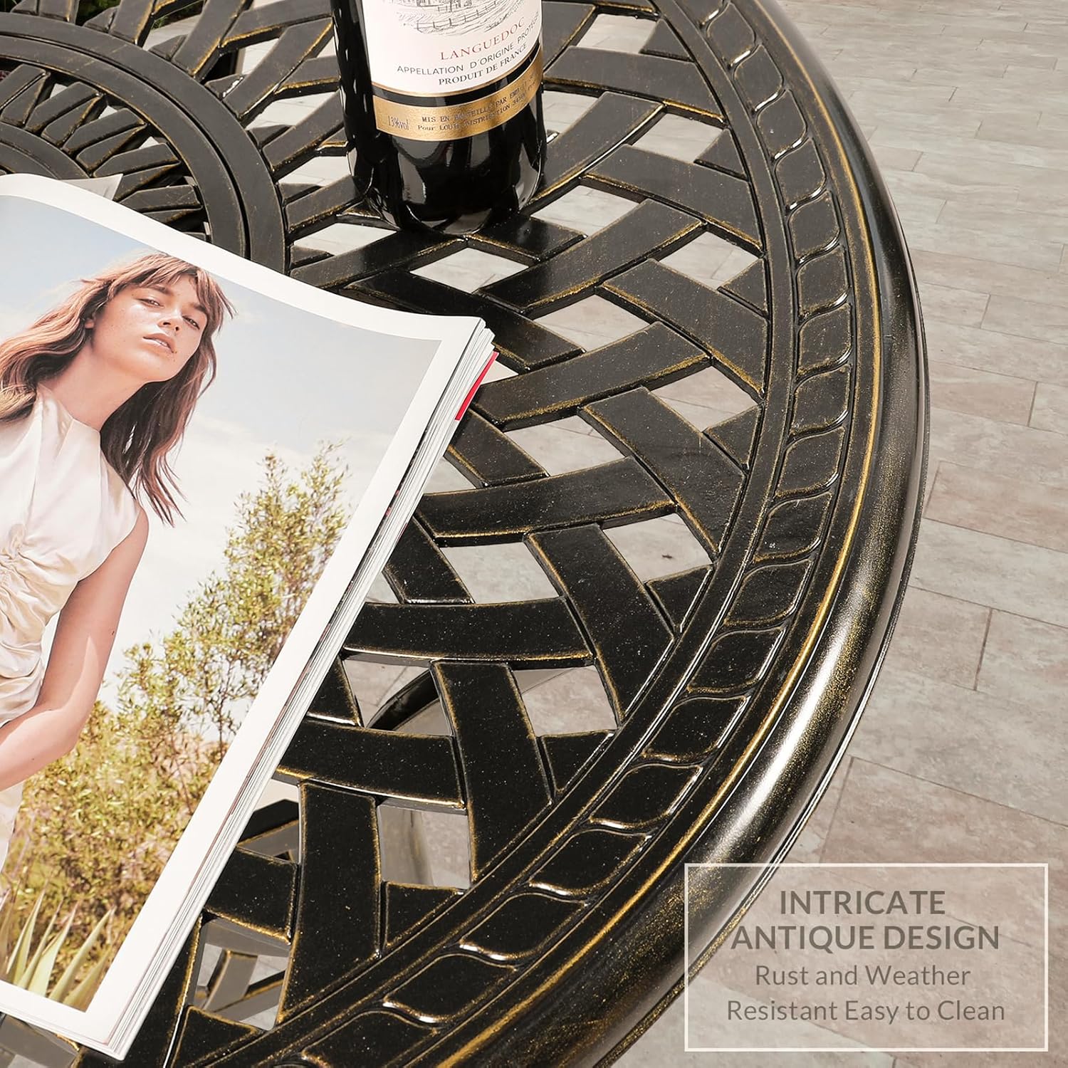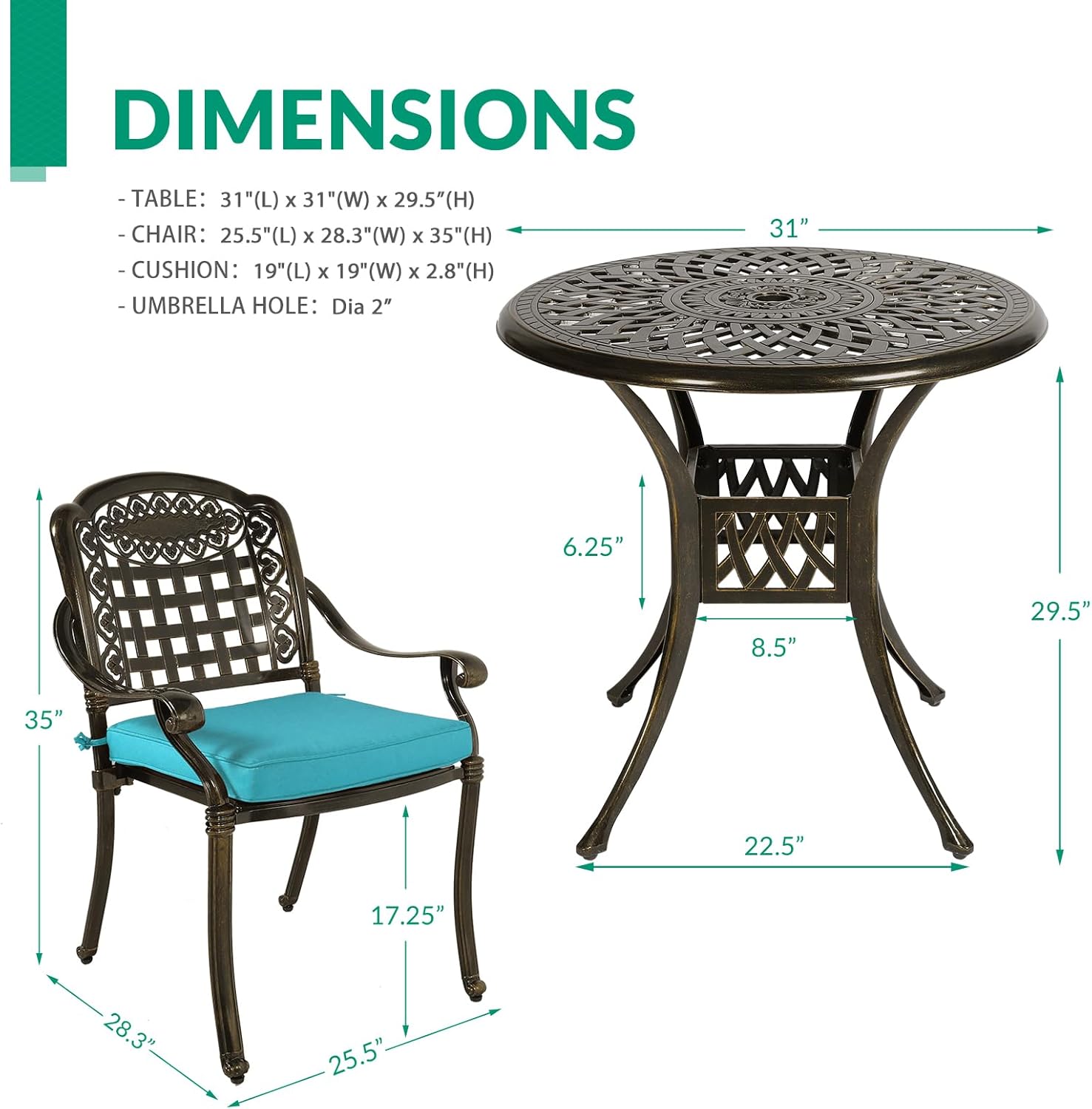 - 【STYLISH APPEARANCE】 - This 3-Piece Dining Set includes 2 stylish and comfortable chairs and 31" round cast table. Elegant cast accents scroll across the chairs and table top, adding a level of sophistication and craftsmanship to the collection. Perfect addition to your patio, yard, deck, or porch