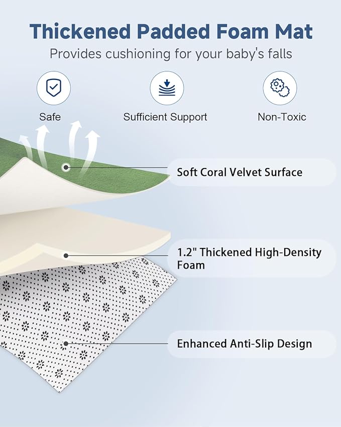 - Thickened Foam Play Mat: Our padded foam mat is made of 1.2 inches thickened memory foam.It's sturdy enough to support two adults without ground feeling. The surface is made of ultra-soft flannel fabric, luxurious and comfortable for babies and family time.It does not fade.It provides a soft and safe play space for babies, encouraging them to explore endless fun with confidence.