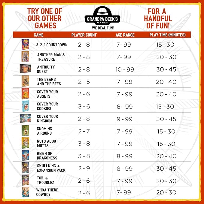 - Best-Selling Family Card Games: With over 3 million sold, Grandpa Beck’s Games are trusted for fun, strategic gameplay. Enjoy hit titles like Skull King and Cover Your Assets—ideal for family game nights, gatherings, or game-loving friends.